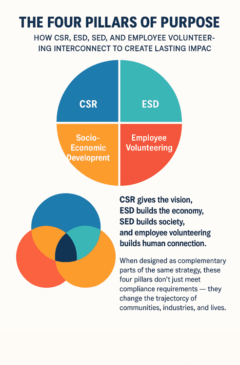 The companies leading in social impact aren’t the ones doing the most projects - they’re the ones integrating them. CSI gives the vision, ESD builds the economy, SED builds society, and employee volunteering builds human connection.