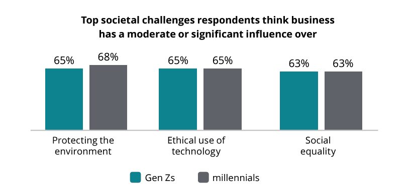Roughly six in 10 Gen Zs and Millennials believe that business has the opportunity to influence a range of societal challenges: