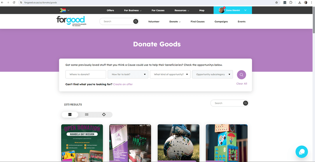 Donating goods on the platform is as easy as pie! Similar to the Volunteer Time journey, the Donate Goods journey allows you to filter through the Donation Opportunities the same way. Once you find an Opportunity that interests you and that you think they can benefit from your previously loved goods, you'll be asked to provide the Cause with your personal details. If the Cause accepts what it is you're donating, then you're all good to go! You can see how simple it is to find a Donation Opportunity here → Donate Goods